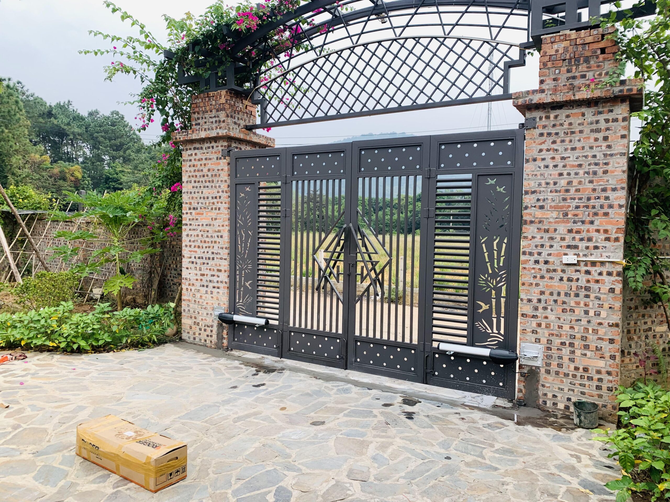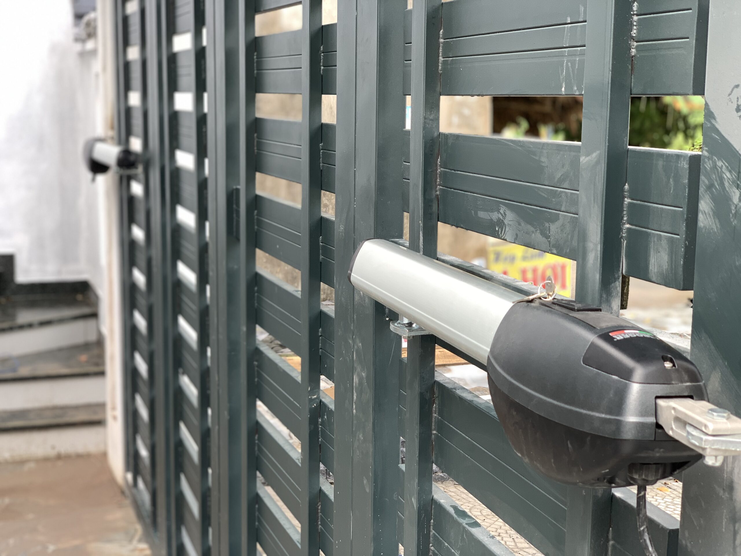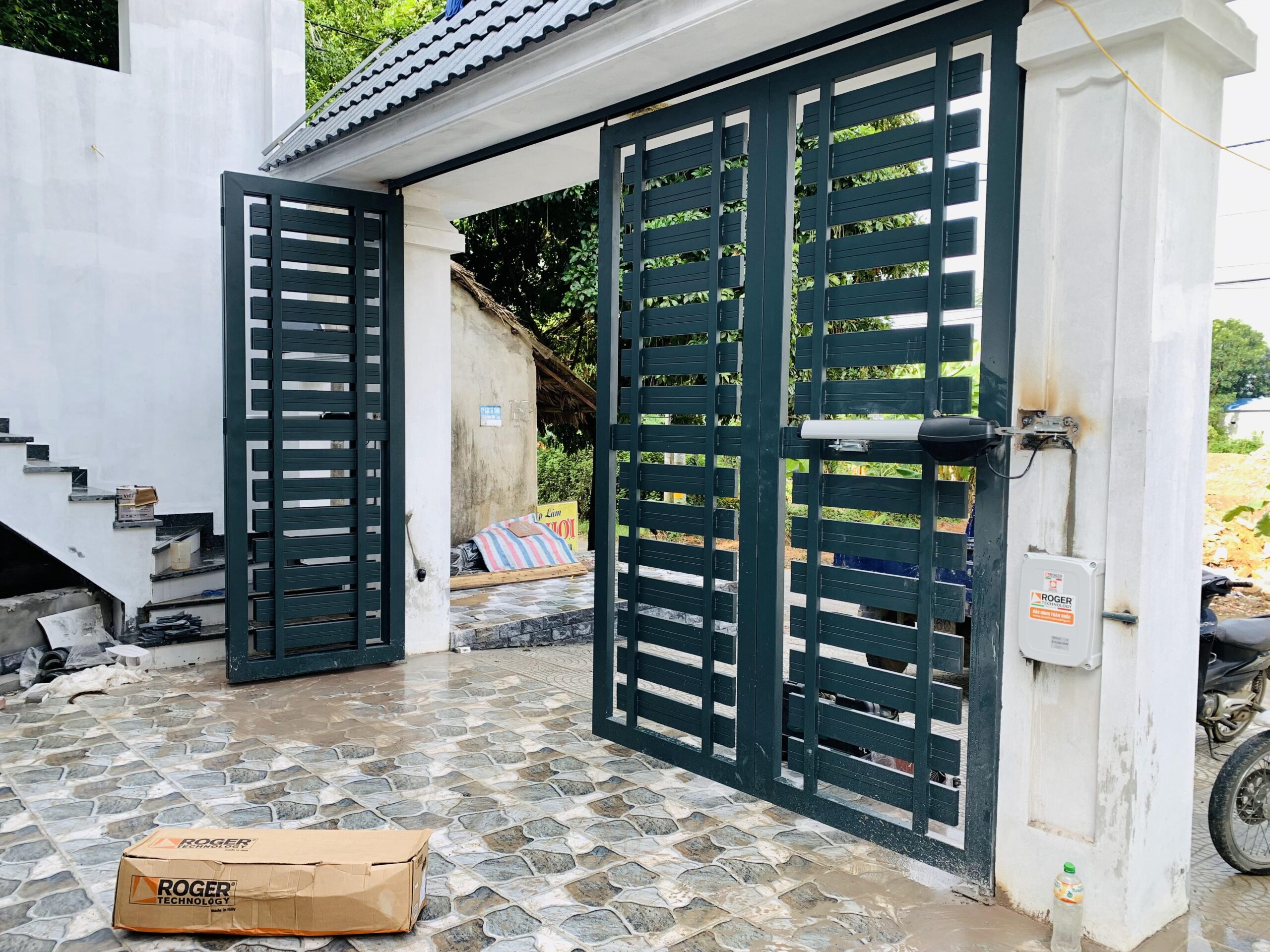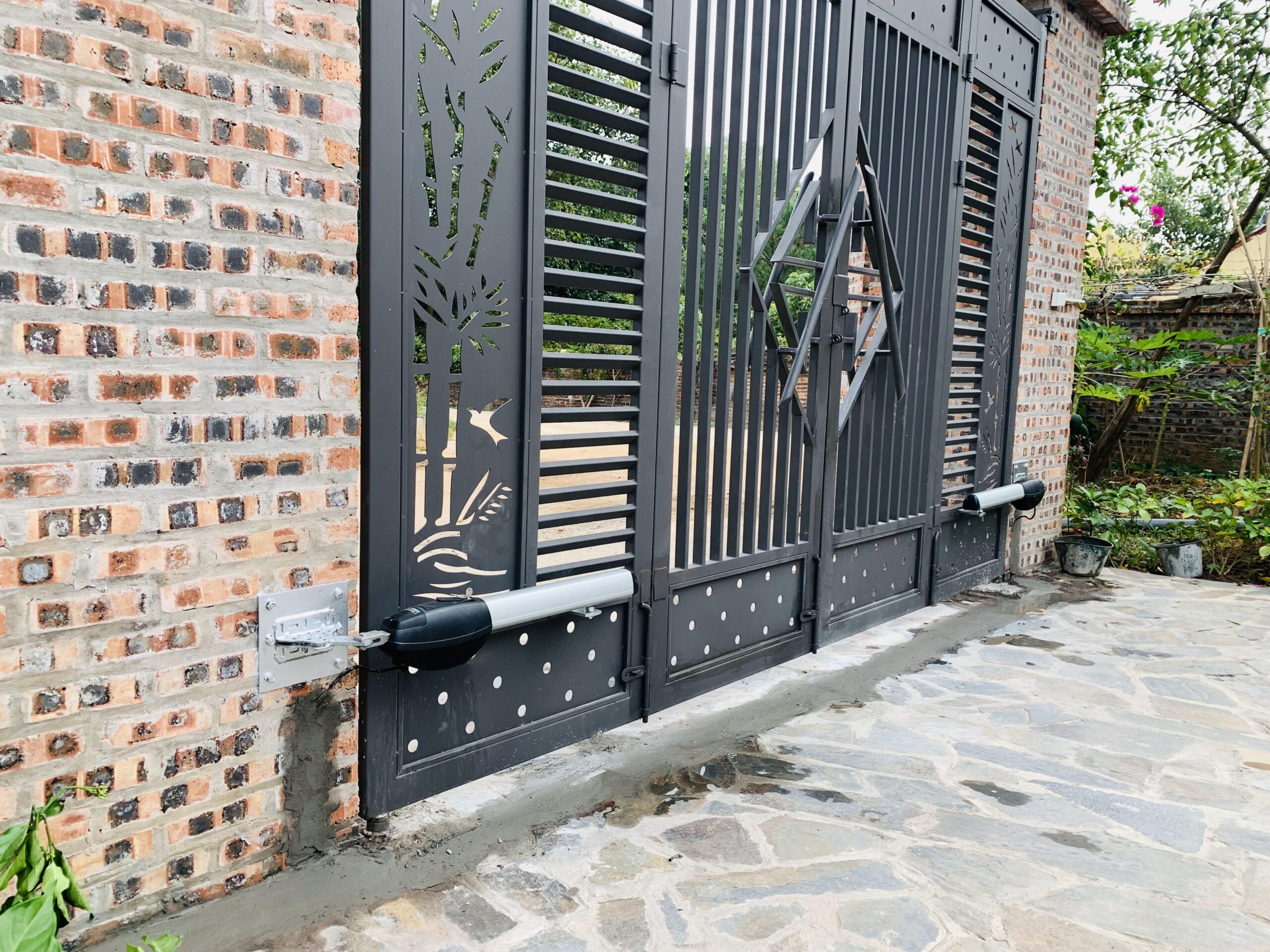 Cổng được điều khiển từ xa bằng remote hoặc nút bấm bên trong nhà.